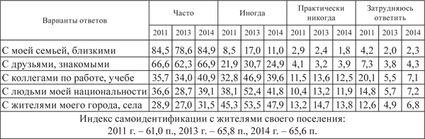 Таблица 14. Распределение ответов на вопрос: «Как часто Вы ощущаете близость с группами людей, с теми, о ком могли бы сказать «Это – мы»?», % от числа ответивших