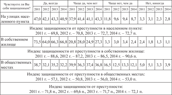 Индекс защищенности от преступности. Беларусь традиционно характеризуется высоким уровнем общественного порядка, проблемы преступности, терроризма и т. д. в настоящее время не являются актуальными для населения, этим объясняется высокое значение индекса: в 2011 г. он составил 71,8 пункта, в 2012 г. – 69,6 пункта, в 2014 г. – 72,1 пункта. Наиболее защищенными граждане чувствуют себя в собственном жилище, менее защищенными – в общественных местах (табл. 15).