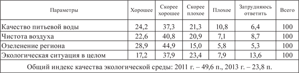 Качество экологической среды. В Беларуси общий индекс качества экологии, по результатам проведенного исследования, составил в 2011 г. 49,6 пункта. К 2014 г. общий индекс качества экологии снизился до 23,8 пункта (табл. 16). Большая половина белорусского населения положительно оценивает экологическую ситуацию в целом, однако у населения возросли требования к качеству питьевой воды, чистоте воздуха, озеленению регионов проживания.