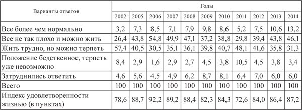 Социальное самочувствие. Индекс удовлетворенности жизнью. В Беларуси на начальных этапах социально-экономических преобразований в стране жизненная ситуация оценивалась населением достаточно тяжело: в 2002 г. 57,4 % респондентов отмечали, что «жить трудно, но можно терпеть», 8,4 % – что «положение бедственное, терпеть невозможно», и только 3,2 % оценивали свою жизненную ситуацию как «нормальную». По мере стабилизации социально-экономической ситуации в 2006–2009 гг. уровень оценок вырос: в 3 раза увеличилась доля тех, у кого в жизни «все более чем нормально» (до 9,8 %), и в 3 раза снизилась доля тех, кто оценивал свое положение как бедственное (до 1,6 %). В связи с кризисными процессами 2011 г. индекс удовлетворенности жизнью в Беларуси снизился с 92,2 пункта в 2006 г. до 72,6 пункта. В 2014 г. индекс удовлетворенности жизнью возрос до 87,2 пункта за счет мер по улучшению материального положения семей (табл. 17).