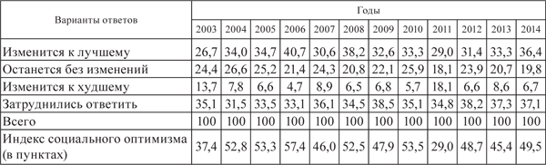 Индекс уверенности в будущем. Оценка перспектив дальнейшего изменения жизненной ситуации свидетельствует о высоком уровне социального оптимизма среди белорусского населения: в 2002 г. 26,7 % белорусов считали, что их жизнь изменится к лучшему, в 2008 г. – 38,2 %, в 2010 г. – 33,3 %; за данный период практически в 2 раза снизилась доля так называемых «пессимистов», полагающих, что их жизнь ухудшится. В Беларуси события 2011 г. обусловили существенное снижение индекса. По сравнению с 2010 г. практически в 3 раза возросла доля респондентов, полагающих, что их жизнь ухудшится. Доля тех, кто верит, что их жизнь изменится к лучшему, не претерпела существенных изменений (около 1/3 населения), ее составляют респонденты, занятые на предприятиях и фирмах, поставляющих продукцию на экспорт и имеющих валютную выручку, которая позволяет им повышать заработную плату занятых соответственно девальвации, инфляции и росту потребительских цен. К 2014 г. ситуация выровнялась, значение индекса возросло с 29,0 п. (в 2011 г.) до 49,5 п.