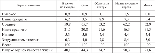 Наиболее высокие оценки качеству своей жизни дали жители малых и средних городов и проживающие в сельской местности, более низкие оценки характерны для респондентов в областных центрах (Брест, Могилев, Гомель, Витебск, Гродно) и столице (г. Минск), что свидетельствует о более высоких притязаниях и уровне запросов проживающих в них категорий граждан, так как по отдельным компонентам качества жизни (уровень доходов, доступность медицинской помощи, образования и иных видов услуг) жители столичного региона и областных центров характеризуются большей обеспеченностью (табл. 19).