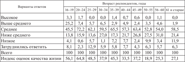 В тендерном разрезе в 2011 г. индекс оценок качества жизни у мужчин (42,5 п.) был выше, чем у женщин (37,6 п.). Фактор образования не оказывал значимого влияния на оценки уровня жизни: у респондентов с высшим образованием индекс оценок качества жизни составлял 41,0 п., а со средним специальным образованием – 43,1 п., статистически значимое различие наблюдается только в группе респондентов с базовым образованием (индекс оценок качества жизни у них составляет 23,8 п.) в связи с невозможностью претендовать на квалифицированные рабочие места. Различия в индексе оценок качества жизни наблюдаются у белорусов различных возрастных групп: наиболее высоко качество своей жизни оценивают молодежные группы в связи с тем, что их материальные, жилищные и иные жизненные проблемы еще помогают решать родители. В более старших возрастных группах значение оценок качества жизни падает: создание семей, необходимость приобретения отдельного жилья, поиска работы, появление иждивенцев (дети, престарелые родители и т. д.) в современных социально-экономических условиях обусловливают более низкие оценки уровня и качества жизни. Наиболее низкими оценками характеризуются старшие возрастные группы (начиная с 50 лет) и это свидетельствует как минимум о трех значимых для Беларуси социальных проблемах. Во-первых, с выходом на пенсию резко снижается уровень жизни пенсионеров, а соответственно, и ее качество, поэтому необходимо принятие действенных социальных механизмов по обеспечению достойной материальной поддержки пенсионеров, обеспечение соответствия размера минимальной пенсии по возрасту величине прожиточного минимума пенсионера. Во-вторых, с возрастом растет численность одиноких граждан, нуждающихся в социальном обслуживании, особенно в сельской местности. В-третьих, в более старших возрастных группах хуже состояние здоровья и это существенно влияет на оценки качества жизни, в условиях, когда качество и доступность медицинского обслуживания оцениваются невысоко, происходит снижение и оценок качества жизни (табл. 20).