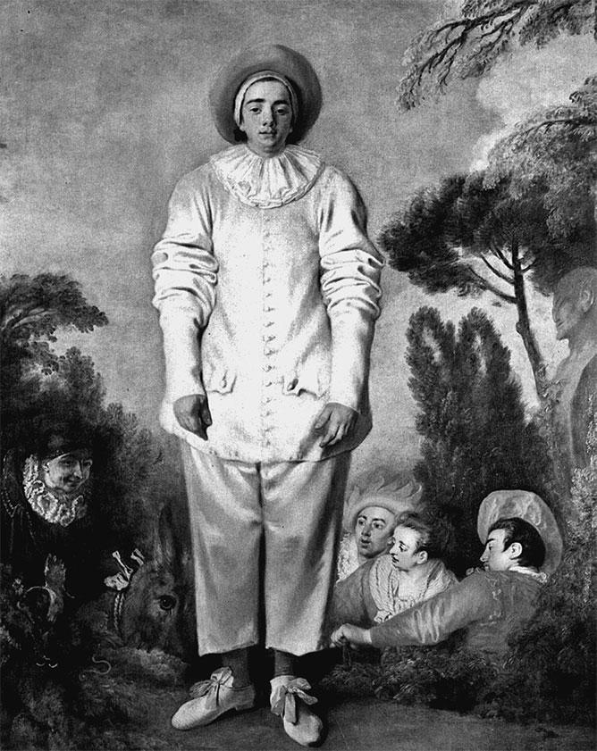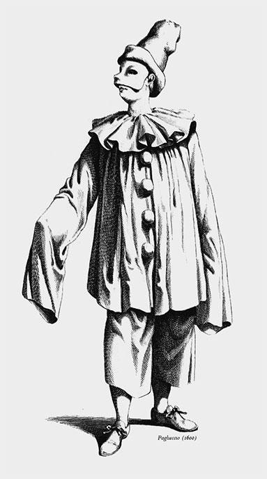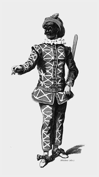 Комедия дель арте, или комедия масок, была распространена в Италии в XVI–XVII вв. Основной ее принцип – импровизация актеров на основе общего сценария. В комедии дель арте имелся стандартный набор масок, примерно десять. Эти маски являются предшественницами такого явления, как театральные амплуа актеров, причем у каждой есть свой постоянный характер и почти каждая имеет традиционный костюм. Маски комедии дель арте следующие: два старика – Панталоне (карикатура на венецианского купца: скупой, расчетливый, подозрительный, но всегда одураченный, ограбленный и даже побитый; склонен читать нотации молодежи; костюм Панталоне – красная куртка, красные штаны и шапка без полей, черная мантия с просторными рукавами, желтые туфли; на лице Панталоне маска с совиным носом, торчащими усами и бородкой; к поясу у него привешены особые атрибуты – кошель с деньгами и кинжал) и Доктор (карикатура на юриста из Болоньи; мнимый ученый, болтун и педант, докучающий всем длинными, нелепыми разглагольствованиями на любую тему; одет в просторную черную мантию с белым воротником и манжетами, широкополую черную шляпу; атрибуты Доктора – книги, бумажные свитки, чернильница, перо; на лице у него черная полумаска, закрывающая только лоб и нос; в комедии он всегда бывал одурачен молодежью и слугами); следующая маска Капитан – карикатура на военного авантюриста, бандита и насильника (костюм его состоял из кирасы с брыжжами, коротких шаровар, короткого плаща и шляпы с перьями; основной комической чертой Капитана было противоречивое сочетание бахвальства с трусостью); следующие маски – двое слуг (Дзанни – «Ваньки»), они делились на первого и второго: первого Дзанни называли по-разному – Бригелла, Педролино (впоследствии Пьеро), Скапино (первый Дзанни – крестьянин-хитрец, ловкач, обтесавшийся в городе и превратившийся в проворного, сметливого лакея, обделывающего любовные делишки господ); второго Дзанни звали Арлекин, Бураттин, Пульчинелла (причем Пульчинелла был из Неаполя, а Арлекин – из Бергамо), он всегда носил черную полумаску с большим крючковатым носом и говорил гнусавым голосом, обязательно откликаясь на злобу дня (под влиянием этого образа появились французский Полишинель и английский Понч), причем Арлекин обязательно был хитрым злоязычным интриганом (костюм Арлекина первоначально состоял из многочисленных разноцветных заплаток, впоследствии замененных правильными треугольниками красного, зеленого и желтого цвета – всемирно известный костюм Арлекина); служанка Сервета или Фантескадва, она же Франческина, Смеральдина, Коломбина (по традиции Коломбина – жена Пьеро и любовница Арлекина) – это крепкая, здоровая крестьянская девушка, неизменная поверенная и соучастница в любовных приключениях своей барышни; два любовника и две любовницы четких масок не имели, но обязательно были умны, красивы, находчивы, и задача у них была одна – любить свою пару. Побои, гримасы, показывание языка, пощечины, удары рукой и ногой, клоунский плач, стуканье лбами, клоунская музыка на трещотках, пузырях, бутылках или погремушках, имитации крика животных и птиц, воспроизведение всякого рода естественных отправлений человеческого организма, кувырки, беготня, прыжки, акробатические и эквилибристические номера являлись непременными, обязательными составными частями ко