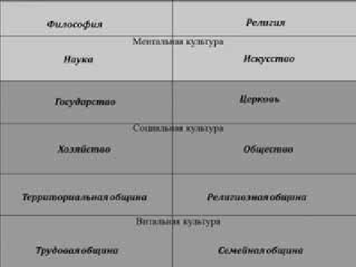 Говоря о системе универсальных механизмов культуры, стоит уточнить, что они по-разному работают на разных уровнях культуры. Как и всякая сложная система, культура имеет свою иерархию, своего рода «архитектуру». Нетрудно, например, выделить в целостной культуре как минимум три «этажа», которые довольно строго артикулируют способы культурной деятельности. Каждая эпоха, каковы бы ни были ее исторические особенности, создает свой уклад повседневной жизни, политический устав общества и систему духовных ценностей. Нижеследующая схема (детали которой будут объяснены в дальнейшем) показывает, что на основе почти неподвижного во времени «витального этажа» стоит динамичный «социальный этаж», над которым в свою очередь возвышается «духовный этаж».