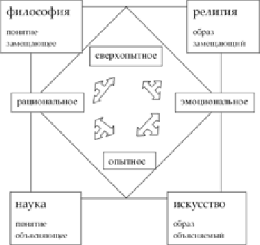 Попробуем классифицировать виды духовной деятельности следующим образом. Допустим, что существуют два мира – опытный и сверхопытный. Существуют также два основных способа реакции на мир – эмоциональный и рациональный. Эмоциональное освоение опытного – искусство. Рациональное освоение опытного – наука. Эмоциональное освоение сверхопытного – религия. Рациональное освоение сверхопытного – философия. Данная классификация – абстрактная модель «чистых» типов. На практике, в развитом виде они включают в себя все иные типы: религия – это и богословие, и теургия, и церковные науки (например, библейская текстология). Искусство – это еще и искусствознание, литературоведение, филология; оно даже может быть в каком-то смысле «философией» и «религией», когда от образов и благодаря им прорывается к идеалу, как, например, это происходит в романах Достоевского. Каждая из четырех сфер духа строится из двух элементов: из образа и понятия. В науке понятие подчиняет себе образы (т. е. факты как развитие того, что дано в чувственном образе), например формула и бесконечное множество подчиненных ей вещей. В искусстве образ подчиняет себе понятия, например образ Гамлета служит основой бесконечного числа толкований. В сфере религии образ выполняет роль понятия, поскольку мы имеем дело со сверхрациональной действительностью, например миф. В философии понятие служит заместителем образа, поскольку основная предметность философии непредставима. Сказанное можно обобщить в виде нижеследующей схемы.