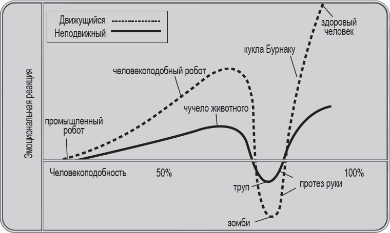 Масахиро Мори создал популярную теорию «зловещей долины».[153] Согласно этой теории, чем больше какое-либо создание напоминает человека, тем более оно нам симпатично. Единственное исключение – «долина» кривой на графике, объединяющая существ, которые выглядят достаточно реалистично, чтобы мы признали их человекоподобными, но в то же время омерзительны настолько, что это может нас напугать. Нас не больно-то интересуют какие-нибудь камни, нам нравится R2-D2, но персонажи в видеоиграх и во многих ранних анимационных фильмах часто выглядят как ожившие мертвецы. И такие персонажи попадают в эту «долину», в провал кривой, поэтому зрителям они нравятся меньше. Нормальные, здоровые люди находятся на вершине данной кривой, и публика любит их больше всего.