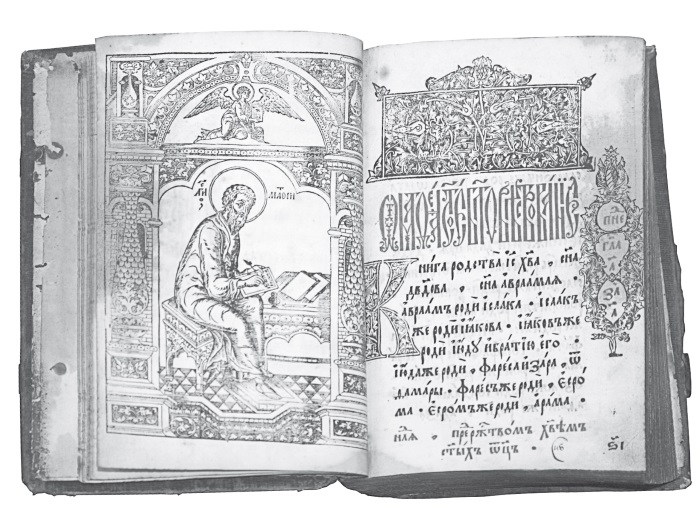 Гравюра с изображением евангелиста Матфея и начало Евангелия. Евангелие. М.: Печ. двор, 1 июня 1628 г. (Музей Библии Иосифо-Волоколамского монастыря)