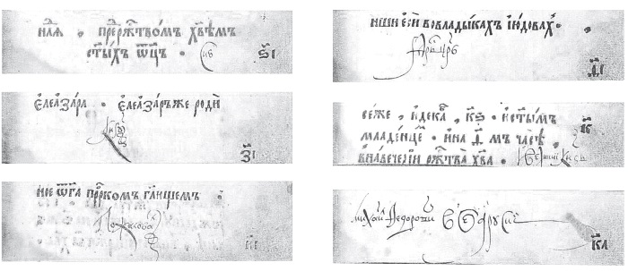 Среди них по количеству покупок выделяются уже знакомые нам по адресам развоза книг города: Вологда – 12 книг, Пермь Великая – 8, Новгород и Суздаль – по 7, Рязань и Коломна – по 6, Кострома – 5, Ростов – 4, Ярославль, Муром, Серпухов, Казань, Галич, Астрахань, Тверь и Троице-Сергиева лавра – по 3 покупки и т. д. 192 экземпляра Апостола (1633), судя по росписи продаж, купили жители 27 населенных пунктов и монастырей России: 9 книг ушли в Казань, 7 – в Ярославль и его окрестности, 6 – в Вологду, 5 – в Кириллов монастырь, по 4 книги приобрели жители Костромы, Мурома и Белева. В росписи указаны также жители Арзамаса, Калязина, Нижнего Новгорода, Переславля, Ростова, Смоленска, Соловков.