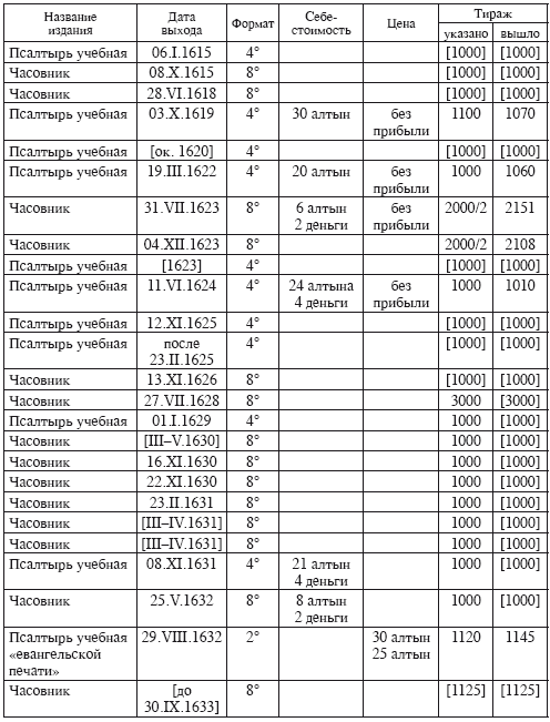 Только один раз для Миней служебных на сентябрь и октябрь, вышедших 12 августа и 9 ноября 1619 г., в царском указе о печати был назван тираж в 500 экземпляров, реальный же составлял 516 и 510 книг. Все следующие издания должны были печататься тиражом уже в 1000 экземпляров. В это время типография еще не умела вести работу так, чтобы из дела выходил именно тот тираж, который был назван в указе. Все издания 20-х гг., которые, очевидно, должны были издаваться тиражом в тысячу экземпляров, реально выходили в количестве от 1010 до 1047 книг. Так, например, Часовник, предназначенный, как говорилось выше, и для общественного, и для частного богослужения, и для обучения, который «вышел из дела» на Печатном дворе 4 декабря 1623 г., согласно указу должен был быть напечатан двумя «заводами», т. е. двумя тиражами. Фактический тираж этой книги составлял 2151 экземпляр, а себестоимость каждого экземпляра равнялась 6 алтынам 2 деньгам (19 коп.). 1922 экземпляра этой книги были проданы «всяким людям» по цене «как в деле стали», т. е. без какой-либо наценки.