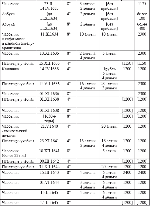 Большие, и без прибыли достаточно дорогие книги получали в эти годы гораздо меньшую наценку – от 40 до 7–8%. Например, продажная цена Триоди постной (выхода 15 декабря 1635 г.) была на 40 % выше себестоимости (2 рубля 25 алтын), цена Минеи служебной на декабрь (1 апреля 1636 г.) – на 26 % выше себестоимости (1 рубль 20 алтын и 1 рубль 9 алтын), а наценка Требника (29 августа 1636 г.) и Псалтыри следованной (4 октября 1636 г.), соответственно, всего 8 % и 7 %.