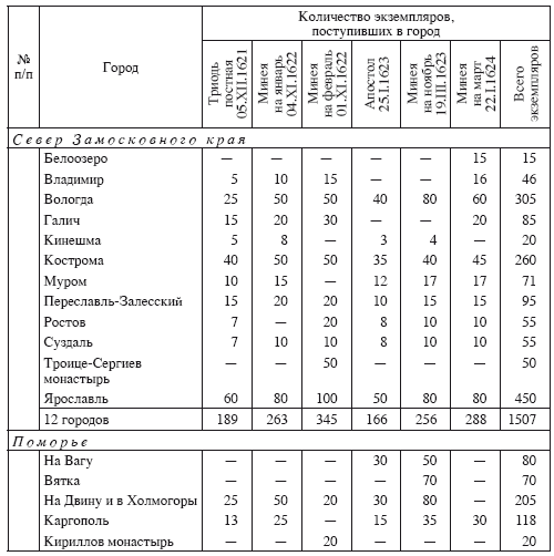Мы видим, что путем централизованного развоза только шести изданий, вышедших в декабре 1621 – декабре 1624 г. (т. е. за 26 месяцев), в 36 городов России – от Каргополя, Белоозера, Новгорода и Тотьмы до Казани, Перми Великой, Чебоксар, Твери, Ярославля и Кинешмы – на периферию страны было доставлено 3755 книг, т. е. более половины (!) всего количества вышедших экземпляров.