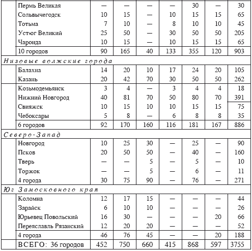 1631 экземпляр (около 23 % тиража) вышеупомянутых изданий Учебной псалтыри в самое ближайшее после выхода книги время купили жители 67 городов, сел и монастырей буквально всей России. И тем не менее основными адресами аккумуляции печатных книжных богатств в первой половине XVII в. традиционно оставались те самые регионы, которые были названы в таблице 2 (с. 64–65): костромичи приобрели 185 Учебных псалтырей (32 покупки), новгородцы – 122 (9 покупок), жители Вологды – 71 книгу (15 покупок).