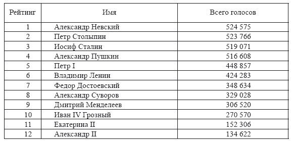 Общий рейтинг двенадцати исторических деятелей, претендующих на победу в проекте «Имя России», определялся путем простого сложения голосов, отданных за номинантов по всем каналам для голосования (СМС-сообщения, телефонные звонки, интернет-голосование). Вот какие результаты получились: