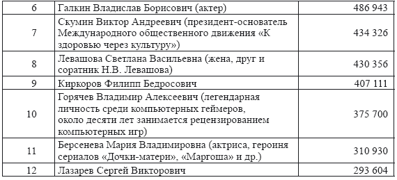9. Левашов Николай Викторович (исследователь проблем мироздания, автор книг «Зеркало моей души», «Неоднородная вселенная», «Последнее обращение к человечеству», «Россия в кривых зеркалах» и др.) – 555 312