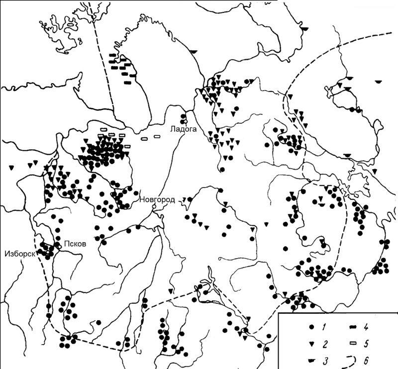 Рис. 7. Карта археологических древностей средневекового Северо-Запада по В.В. Седову: 1 – курганные моглильники словен новгородских и кривичей; 2 – курганные могильники води и веси; 3 – грунтовые могильники веси; 4 – могильники корелы; 5 – могильники ижоры; 6 – приблизительная граница Новгородской земли
