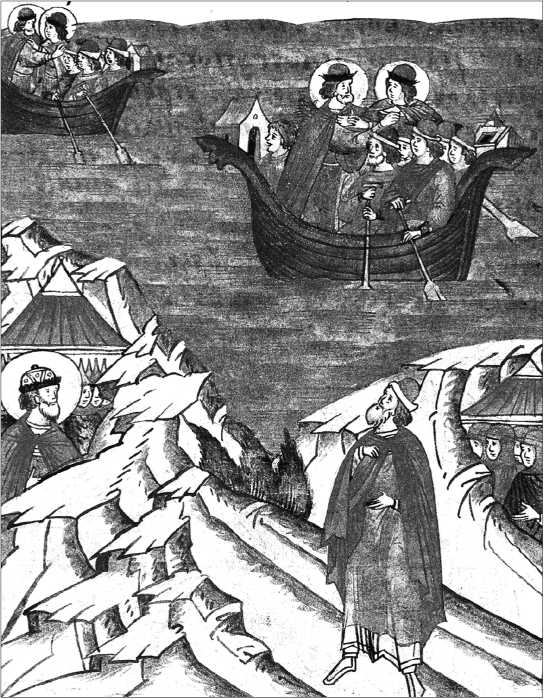 И пошел на них в день воскресения, июля 15, в день памяти шестисот тридцати святых отцов бывшего в Халкидоне собора и святых мучеников Кирика и Улиты имея же веру великую во святых мучеников Бориса и Глеба. И был некий муж, старейшина земли Ижорской, по имени Пелгусий. Поручен же был ему морской дозор. Восприял же святое крещение и жил среди рода своего, который оставался в язычестве. Наречено же было имя ему в святом крещении Филипп. И жил он богоугодно, соблюдая пост в среду и пятницу. Поэтому удостоил его Бог увидеть необыкновенное видение в тот день. Расскажем об этом вкратце. Разведав о силе войска, он пошел навстречу князю Александру, чтобы рассказать князю о станах их и об укреплениях (рис. 20). Когда стоял Пелгусий на берегу моря и стерег оба пути, он не спал всю ночь. И когда же начало восходить солнце, он услышал на море страшный шум и увидел ладью, плывущую по морю, а посередине ладьи – святых мучеников Бориса и Глеба, стоящих в одеждах багряных и держащих руки на плечах друг друга. А гребцы сидели, словно окутаны облаком. И сказал Борис: „Брат Глеб, вели грести, да поможем сроднику своему Александру“. Увидев такое видение и услышав слова мученика, стоял Пелгусий потрясенный, пока ладья не скрылась с глаз его. Вскоре после этого приехал князь Александр. Пелгусий же взглянул радостно на князя Александра и поведал ему одному о видении. Князь же ему сказал: Об этом не рассказывай никому. После того решился напасть на них в шестом часу дня. И была сеча великая с латинянами, и перебил их бесчисленное множество, и самому королю возложил печать на лицо острым своим копьем.