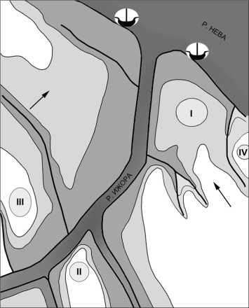 При изучении Невской битвы одним из наиболее важных является вопрос о месте, где она происходила (рис. 34). Письменные источники содержат лишь общие сведения, сообщая о стоянке шведских войск: «В Неве Устье Ижоры», «приде в рику Неву и ста Усть Ижеры…» [ПСРЛ 2000, т. III, с. 77, 291]. Учитывая, что это первое летописное упоминание конкретного пункта на реке Неве и летописец знал о нем только понаслышке, оно может быть ориентировочным. Точное место стоянки шведов могло находиться на некотором удалении от места впадения Ижоры в Неву и даже напротив него; и выбор его мог определяться какими-то ландшафтными или гидрографическими условиями; с учетом того; что устье Ижоры все же было ближайшим географическим ориентиром.