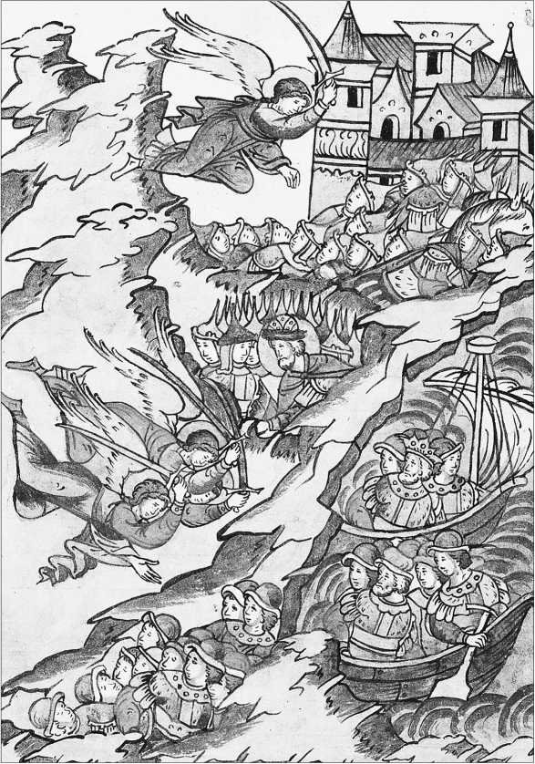 Рис. 40. Помощь небесных сил русскому воинству на другом берегу Ижоры.