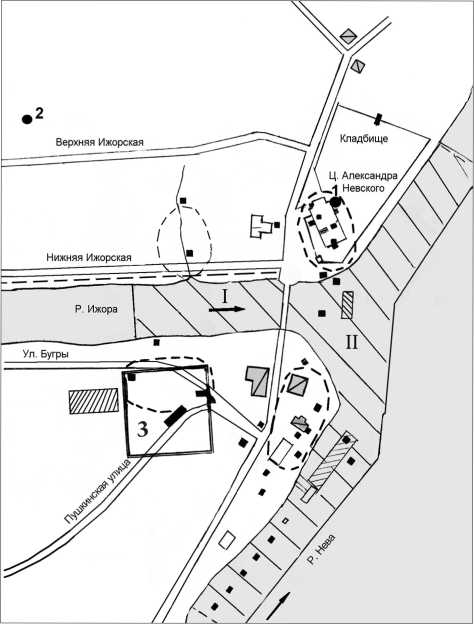 Имеются сведения о находках человеческих останков на берегах Невы, в ее среднем течении, приведенные А.А. Иностранцевым, искавшим здесь следы пребывания древнего человека: «…в некоторых местах того же побережья Невы, в подмытых водою обрывах, мне нередко приходилось наблюдать обнажение целых людских скелетов, покоющихся неглубоко под растительным слоем, а у самаго уровня воды – вымытыя из наноса и разбросанныя отдельныя части костяков. Здесь, очевидно, было или кладбище или просто место захоронения людских трупов после битв» [Иностранцев 1910]. Как известно, ученый отдыхал в районе Ивановского, но в каких местах он видел эти погребения – неизвестно. Есть и другие сведения, о человеческих останках в береговом обрыве Невы, примерно в 100 м выше устья реки Славянки[19]. Однако следует учитывать, что подобные находки могут быть забытыми кладбищами, находившихся на невских берегах старых деревень.