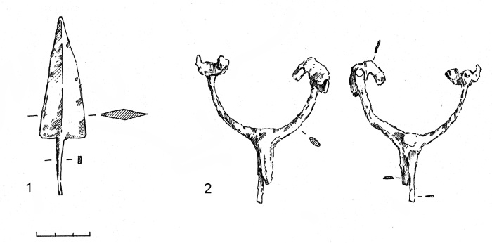 1 – наконечник стрелы, 2 – фрагмент скребницы;