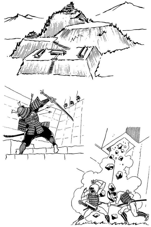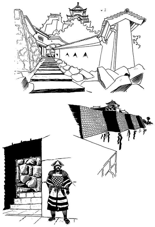 По своей структуре замок феодальных времен эволюционировал в сложную и в конечном итоге практически неприступную крепость. Обычно он проектировался как серия «концентрических укреплений, отделенных друг от друга крепостными валами, рвами или стенами» (Kirby, 12) и представлял собой такую запутанную сеть замкнутых двориков и соединяющих их проходов, что, даже если одно из укреплений попадало в руки нападавших, его можно было отбить с любой из сторон или полностью отрезать без существенного ущерба для обороноспособности остальных укреплений. Подход к его укрепленному периметру защищали заполненные водой ямы, канавы и искусственные трясины или комбинация из всех этих трех заграждений. Как рассказывает Кирби, наполненные водой рвы (хори) считались «лучшей гарантией от проникновения». Земляные стены (дои) или стены из камня (исигаки) тяжеловесно вздымались над этой первой оборонительной линией, оставляя лишь два прохода – сильно укрепленные главные ворота (отэмон) и такие же прочные, но меньшие по размеру задние ворота (карамэтё). Обычно ворота были сделаны из толстых бревен, обитых медными или железными листами. Характерной особенностью внутренних проходов, связывающих один дворик с другим и отдельные укрепления друг с другом, как правило, являлись хитроумно устроенные двойные ворота (масугата), в которых первые ворота были расположены под прямым углом ко вторым, и в пространстве между ними (контролируемом сверху и с боков) могло поместиться лишь определенное количество людей – так, например, по решению Хидэёси это максимальное число должно было составлять 240 пеших воинов или 40 всадников.