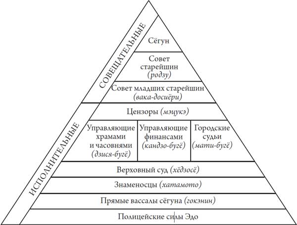 Структура правительства Токугава (таблица 4) имела следующий вид: совет из четырех или пяти старейшин (родзу), которые избирались из самых могущественных даймё категории фудаи, имевших собственные замки, где часто председательствовал Великий старейшина (тайро); совет младших старейшин (вака-досиёри), также избиравшихся из фудаи, но тех, кто не имел собственного замка; управляющие храмами и часовнями (дзися-бугё); управляющие финансами (кандзо-бугё); городские судьи (мати-бугё), которые входили в состав верховного суда (хёдзосё) и могущественные цензоры (мэцукэ), которыми руководил Великий цензор (о-мэцукэ). Под этими органами размещалась широкая масса исполнителей, включавшая упоминавшихся ранее хатамото и гокэнин, сборщиков налогов (дайкан) и полицейские силы. Последние несли службу в районах Эдо и состояли из стражников (ёрики), полицейских (досин), патрульных (оккапики) и официальных надзирателей, которые контролировали наиболее важные точки в городе. Надзиратели над военными резиденциями (цудзибан) разделялись в соответствии с областями, вверенными им для наблюдения: надзиратели кварталов хатамото (кумиай-цудзибан), надзиратели кварталов даймё (даймё-цудзибан) и прямые надзиратели правительства (коги-цудзибан). Кварталы простолюдинов имели своих собственных надзирателей (дзисимбан) и стражников у ворот (бантаро), которые в десять часов вечера закрывали ворота, расположенные в конце каждой городской улицы, после чего никто не мог через них пройти без разрешения властей.