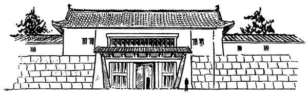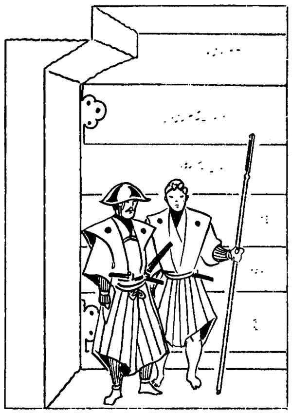 Мощеная дорожка вела от парадных ворот до входа в главное здание – резиденцию правителя (годэн), днем и ночью бдительно охранявшуюся избранными воинами. Эти воины были «единственными вассалами (за исключением нескольких личных слуг правителя), которым дозволялось посещать годэн в ночное время. Все остальные, в том числе повара и кухонные работники, имели жилища, отведенные им в нагайя, и они приходили туда рано утром, чтобы вновь приступить к своим обязанностям» (McClatchie 1, 173).