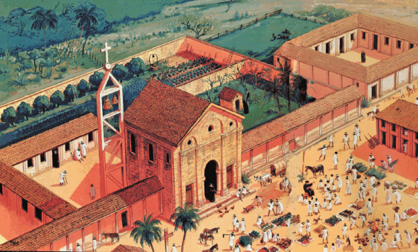 Антирабовладельческой была деятельность миссионеров, которые строили небольшие поселки для индейцев, в которых учили аборигенов читать и писать, обращая коренное население Америки в христианство, препятствовали его истреблению. Вот почему миссии нередко разрушались. На современной реконструкции показан типовой план миссии.