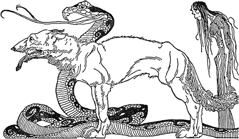 Локи – «зачинщик распрь между асами, сеятель лжи и позорище богов и людей» – всего лишь причисляется к богам (Видение Гюльви) и посредничает между ними и великанами. Ангрбода («сулящая горе») – старая ведьма, сидящая в Железном Лесу к востоку от Мидгарда. Из ее с Локи детей выделяются волк Фенрир, Мировой змей Йормунганд (Ёрмунганд) и хозяйка преисподней Хель (о ней см. «Страшные немецкие сказки»). Однако этой троицей потомство Ангрбоды не ограничивается: