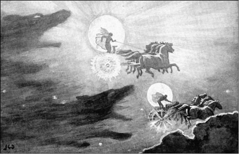 Волки преследуют Солнце и Луну. Иллюстрация Д. Доллмана (1908)