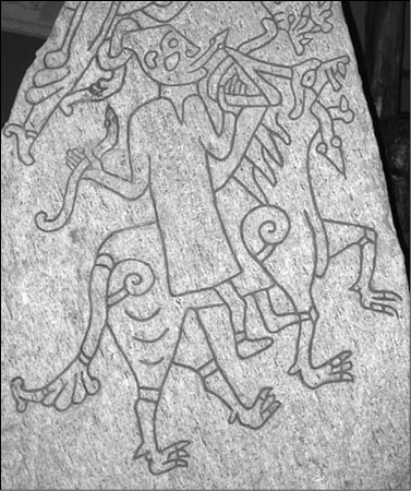 Рунический камень, изображающий великаншу Хюррокин (X в.). Обратите внимание на змеиные жала волка и его хозяйки