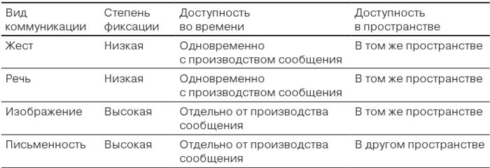 Представим эволюцию видов коммуникации, описанную на основе основных характеристик коммуникации: степень фиксации, доступность во времени и в пространстве (см. табл. 3.1).