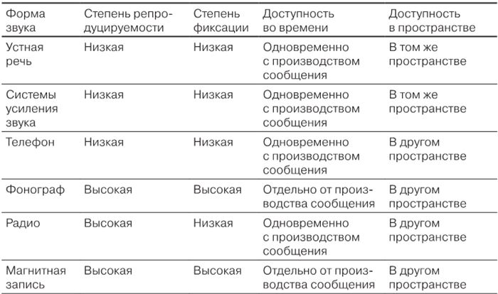 Как видно из таблицы 3.4, ранние формы, которые лишь усиливали звук и акустику в помещениях, не повышали степени репродуцируемости самой речи, которая не могла при таком подходе коммерциализироваться, хотя акустическая технология и делала ее доступной чуть большему количеству людей. Однако единство места и времени сохранялось. Пространственное расположение реципиента по отношению к производителю сообщения изменилось с изобретением телефона, но и он не сделал доступным массовое тиражирование речи и ее коммерциализацию: телефонная связь коммерциализируется не как индустрия контента, а как услуга, и именно поэтому ей свойственна низкая степень репродуцируемости.