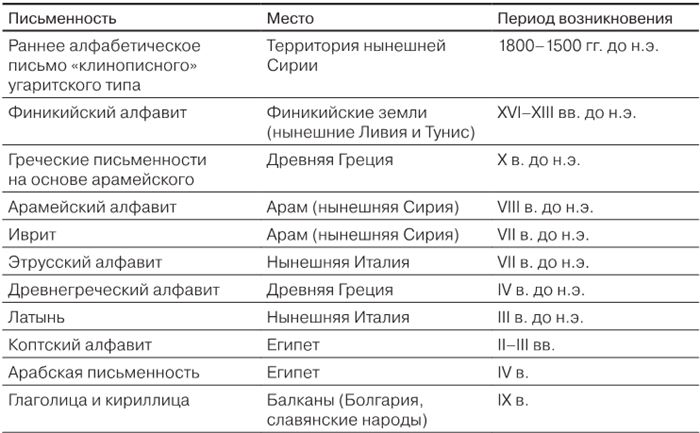 На древнегреческий также опирается коптский алфавит, легший в основу глаголицы, а затем и кириллицы. Финикийская письменность в VIII в. до н. э. на востоке Средиземноморья породила еще один алфавит – арамейский, давший иврит, используемый по сей день. А в IV в. уже нашей эры из арамейского письма возник арабский алфавит – на основе согласных, к которым были добавлены вокалические звуки. Затем в ходе эволюции распространились разные типы арабской письменности, почерков и т. д. Проиллюстрируем возникновение разных видов алфабетического письма в виде таблицы (см. табл. 3.5).