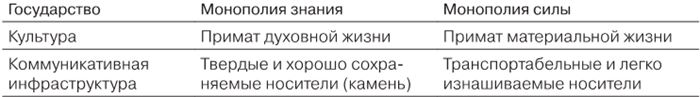 В таких местах, как Междуречье и Египет, где писали на глиняных табличках при помощи пиктограмм (клинопись) и активно использовали нанесение письменности на каменные постройки, возникали централизованные деспотичные империи, основанные на центральной власти монарха. Носитель высокого уровня фиксации (глиняные таблички, высечки на камне и т. д.) способствовал централизации власти, представлению о ней как о нерушимой сакральной ценности. Иннис называл такие политические формы правления монополией знаний, имея в виду то, что монополией в области формирования идеологий, коммуникации обладало государство. В тех империях, где развивались более транспортабельные носители, возникал примат материальной культуры и наук над религиозными духовными нормами. В таких государствах действовала более демократичная система правления, построенная на верховенстве закона, развитии универсальных правил, распространяемых благодаря более транспортабельным и доступным носителям. Такая система господствовала в Древней Греции. Отсутствие сакрального смысла власти, которая поддерживала идентичность подобного рода государств, предполагала необходимость содержания административного аппарата для осуществления принуждения и исполнения законов. Подобное государство Иннис называл обладающим монополией силы[87] (см. табл. 3.6).