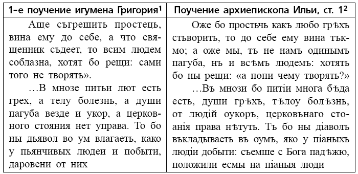 Поучение архиепископа Ильи (Иоанна) использует и южнорусские источники. Уже отмечалось запрещение брать лихвы, сложившиеся, как представляется, под влиянием Изложения правилом апостольским и отеческим. Однако наибольшее влияние Поучение испытало от сочинений, которые я считаю принадлежащими андреевскому игумену Григорию. Жанровое единство (Поучения) и общий адрес (сочинения предназначались приходским священникам) создали предпосылки для широкого использования сочинений Григория в новгородском Поучении. Илью привлекли рассуждения Григория об ответственности священников, критика духовенства, погрязшего в пороках. Выдержки из сочинений Григория мы находим в 14-й и 9-й статьях Поучения.