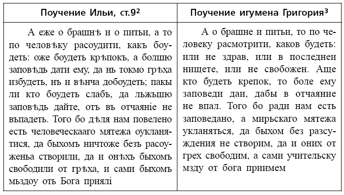 Значительно ближе к тексту источника те статьи Поучения, которые восходят к вопросам самого Ильи, обращённым к Нифонту. В обширной 18-й статье содержится фраза, буквально повторяющая ответ Нифонта Илье «Во своей бо жен? нетоуть гр?ха»[313].