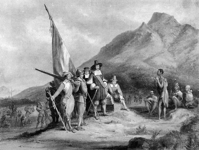 Создание первой поселенческой колонии. 6 апреля 1652 г. у подножия плоской, как стол, горы в удобной бухте на мысе Доброй Надежды бросили якорь три голландских судна. Из них высадились семьдесят человек, в основном голландцы, но также и немцы и представители некоторых других европейских народов, во главе с тридцатитрехлетним капитаном – Яном ван Рибеком. Они построили форт у подножия горы, которую, как и бухту, назвали Столовой. Этот форт стал началом города Капстада (города у мыса), ныне носящего название Кейптаун.