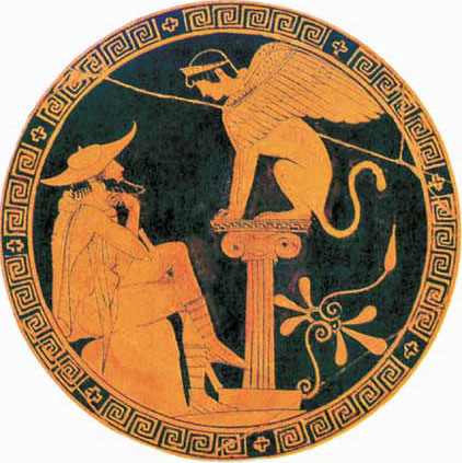 Античный мастер изобразил Эдипа, спокойно расположившегося на камне перед Сфинксом, восседающим на невысокой колонне с капителью ионийского ордера. Сценка более всего напоминает – по своей атмосфере – неторопливую беседу двух философов-платоников. Эдип сидит нога на ногу, с изысканной задумчивостью подпирая лицо кистью левой руки. Иконографически он несколько напоминает Гермеса. Такое сходство вряд ли случайно. В облике Сфинкса нет ничего устрашающего. Сочетание несочетаемых форм приведено в полную гармонию. Менее всего Сфинкса можно назвать чудовищем, но нет в трактовке этого образа и – не лишенной извращенности – чувственности, которой наделяли его позднее. Говоря в духе Софокла, Сфинкс – это «Дева-вещунья». Одним словом, перед нами произведение классического периода, чуждого архаическому иератизму, вполне ощутимому в изображениях VI в. до Р. Х. (например, Дельфийский сфинкс).