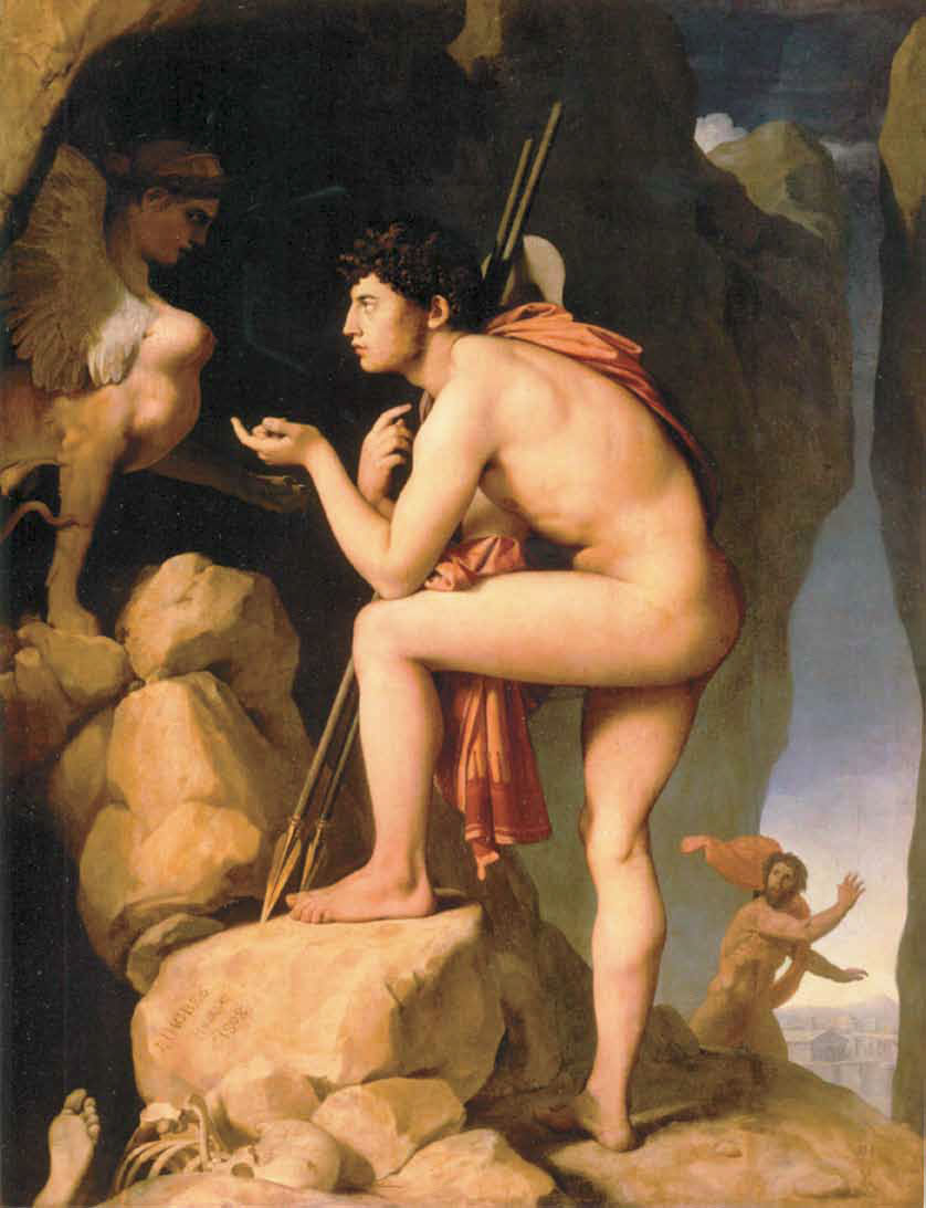 На античной чаше (из ватиканского собрания) соблюдено – полное классической гармонии – равновесие между образами Эдипа и Сфинкса. На картине Моро о равновесии нет и помину. Оно драматически нарушено: Сфинкс дан в момент рокового прыжка из бездны на грудь ошеломленного Эдипа. У Энгра крен в другую сторону. Композиционно доминирует фигура Эдипа. Античный Эдип (на чаше) – мудрец (полу-Платон, полу-Гермес), спокойно созерцающий возникшую перед ним сверхчувственную имагинацию. Эдип у Моро – измученный проблемами «Цветов зла» – парижанин-декадент. Эдип кисти Энгра – сильный, полный энергии француз эпохи победоносного Наполеона, портреты которого особо удавались гениальному живописцу. Сфинкс, напротив, задвинут в сторону. Фигура его срезана наполовину: видна только мощная женская грудь, довольно тонкие лапы, часть правого крыла и сумрачное лицо. Сфинкс Моро потрясает своим мистическим правдоподобием с сюрреалистическим оттенком. Сфинкс Энгра – фрагмент парковой скульптуры. Сходство со скульптурой объясняется отчасти тем обстоятельством, что отец мастера был скульптором и нередко, как известно, ваял Сфинксов для парков и садов. Мальчик, так сказать, возрастал в обществе этих странных существ. Для Энгра, человека, сложившегося в наполеоновскую эпоху, Эдип был образом, символически выражающим триумф человеческого разума над иррациональными силами. Поэтому на картине Эдип изображен – в момент нахождения ответа на роковую загадку Сфинкса – с жестом человека, полностью уверенного в своей силе и правоте. Мистический характер сочетания несочетаемых форм в образе Сфинкса не имел для художника, воспитавшегося в мастерской Давида, никакого значения. Примечательно, что лицо Эдипа носит автопортретный характер. Двадцативосьмилетний Энгр (в то время стипендиат французской Академии в Риме) смотрел на жизнь (представавшую в образе Сфинкса) с мужественным сознанием того, что ему удастся одержать над ней победу.