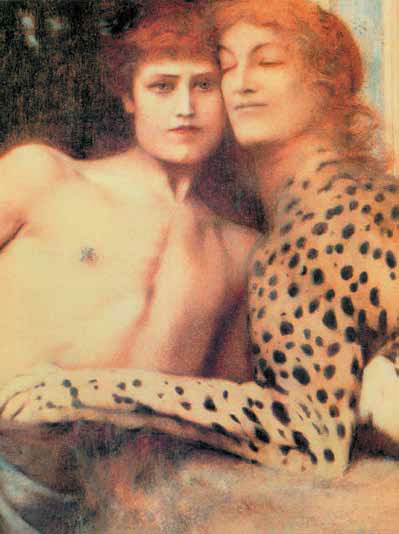 Завершить изобразительный ряд символистских произведений, использовавших античный образ Сфинкса, можно картиной Франца фон Штука «Поцелуй Сфинкса». Дата не без значения: фон Штук как бы завершает путь, начатый Энгром в 1808 г. и тем самым исчерпывает изобразительные возможности символистской интерпретации Сфинкса. Даже можно отметить некий ритм: «Поцелуй Сфинкса» создан в 1895 г., а картина Кнопфа – в 1896. Равно как «Эдип» Моро написан в один год с последней версией «Эдипа» Энгра: 1864 год.