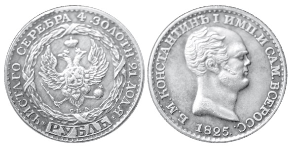 Повторимся, ни официальных уведомлений, ни каких-либо указаний на этот счёт издано не было. Общество находилось в полном неведении. Вот почему едва в Петербурге узнали о смерти Александра I, как в витринах магазинов появились портреты нового императора – Константина I, а на Монетном дворе приступили к чеканке монеты с его изображением. За короткий период междуцарствия выпустили шесть пробных монет. Они ожидали высочайшего утверждения. Понятно, что с окончанием междуцарствия вопрос о новом металлическом денежном знаке отпал сам собой.