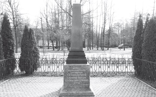 Летом 1917 года, во время рытья канавы для водопровода на острове Голодай, рабочие наткнулись на гроб с останками некоего военного в форме николаевского времени. И хотя гроб был один-единственный, по городу пошла «гулять легенда» о том, что найдены гробы с казнёнными декабристами. Легенда вызвала такой мощный отклик среди художественной и научной общественности, что на месте этой случайной находки в 1926 году установили существующий до сих пор обелиск в память о пяти казнённых. Трёхметровый памятник из чёрного гранита по проекту В.Н. Боброва появился к 100-летию со дня казни П. Пестеля, К. Рылеева, С. Муравьёва-Апостола, М. Бестужева-Рюмина и П. Каховского. Правда, в 1980-е годы возникла ещё одна версия тех давних событий. Согласно ей, захоронение казнённых декабристов произошло на территории современного завода «Алмаз», там же, на острове Голодай. Во всяком случае, и на этом предполагаемом месте погребения пяти повешенных установили памятный знак.