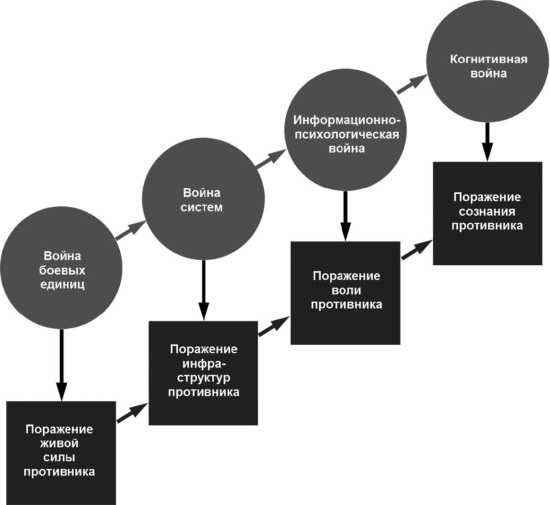 Классические военные стратегии основывались на понимании войны как столкновения боевых единиц. Целевой ориентир такой войны заключался, соответственно, в поражении живой силы противника. Война велась войсками, не изменяя принципиально жизни невоенизированной части общества. Это становится невозможно при переходе к следующему этапу развития военных стратегий. В войну систем включались не только армии, но и все ресурсы экономики, государственного управления, культурных потенциалов и идеологии. Побеждали уже не армии, а системы. Главное в этой войне было не столько поразить живую силу противника, сколько подорвать его инфраструктуры, сделать невозможным функционирование системы. Информационно-психологическая война была сфокусирована уже на подавлении воли противника. Его необязательно было уничтожать физически. Достаточно было подавить в нём дух борьбы. Для этого могли использоваться различные демотиваторы. Когнитивная война отличается от информационно-психологической. В ней подавляется и подчиняется сознание противника. Если результатом информационно-психологической войны является нежелание противника продолжать борьбу, то результатом когнитивной – внушение ему мысли, что самой борьбы нет. Противник когнитивно программируется на саморазрушение и даже самоликвидацию (рис. 2) [12].