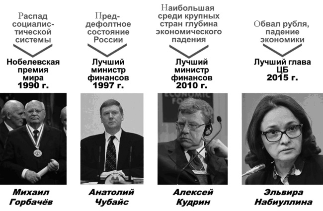 Обратимся к некому историческому ряду. 1990 год: Нобелевская премия вручается Михаилу Горбачёву. За год до этого рухнула международная социалистическая система, через год прекратит своё существование и Советский Союз. 1997 год: лучшим министром финансов признается Анатолий Чубайс. Россия тогда находится в преддефолтном состоянии. 2010 год: лучшим министром финансов признается Алексей Кудрин. До этого, в 2009 году, в ситуации мирового финансово-экономического кризиса Россия из всех ведущих держав мира имеет наибольшие показатели падения. Наконец, 2015 год, недавнее решение лучшим в мире главой Центрального государственного банка признаётся Эльвира Набиуллина[13]. Обвал рубля в 2014 году и продолжающееся падение в 2015 году заставляет предположить, что чем хуже показатели в России, тем больше шансов у российских министров получить награждения на Западе (рис. 3).