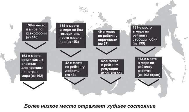 Препятствие это обнаруживается достаточно просто. Обратимся к рейтингам, в которых берутся показатели отношения не к качеству государственного управления, а к населению, к стране в целом. Рейтинги, необходимо подчеркнуть, составляются экспертами. Чем место ниже, тем положение соответствующей страны хуже. Нас интересует, естественно, положение России. Итак: 138-е место России по рейтингу ксенофобии (из 140 стран); 138-е – по уровню благотворительности населения (из 153 стран); 49-е место по рейтингу порочности (из 57 стран); 188-е по рейтингу свободолюбия населения (из 199 стран); 153-е место среди самых опасных стран для проживания (из 162); 42-е по рейтингу доброты (из 48); 52-е по рейтингу общему интегральному репутации страны (из 55); 113-е по рейтингу рабства (из 162 стран) (рис. 4)[14].