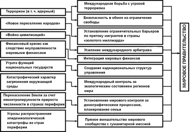 А в итоге, суммируя ответы на каждый из обозначенных вызовов, все предложения сводятся к усилению роли международного сообщества в управлении мировыми процессами. Другими словами, речь идёт о создании «мирового правительства». Само понятие пока публично не озвучивается. Но именно это и подразумевается как итог разрешения глобальных проблем (рис. 16).