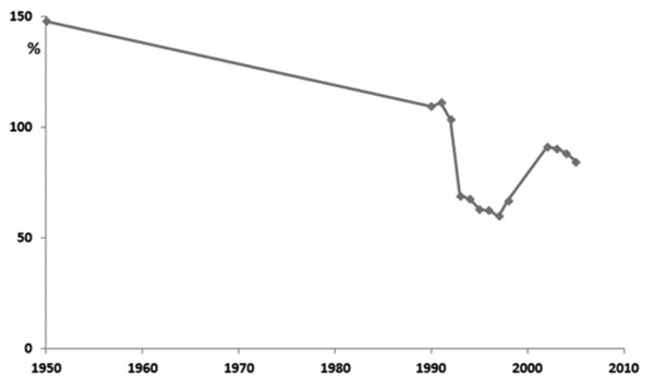 Рис. 21. Динамика отношения зарплаты в сфере науки к средней зарплате в стране (в %)