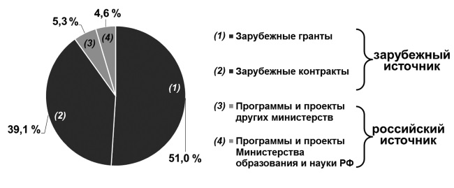 Безусловно, международное сотрудничество для развития национальной науки необходимо. Без него, будучи изолирована, она может оказаться в состоянии стагнации. Но достаточно посмотреть на долю зарубежных и российских источников в финансировании научных исследований в рамках международного сотрудничества, чтобы убедиться, в чьих интересах и по чьему целевому заказу это сотрудничество осуществляется (рис. 22) [47].